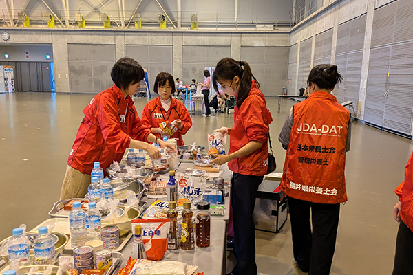 日本栄養士会は大規模自然災害発生時に被災地での栄養・食生活支援活動を行うために、日本栄養士会災害支援チーム(JDA-DAT)を設立しました。JDA-DATは都道府県栄養士会が養成するJDA-DATスタッフと日本栄養士会が養成するJDA-DATリーダーで構成され、国や被災地と連携して支援活動を行っています。